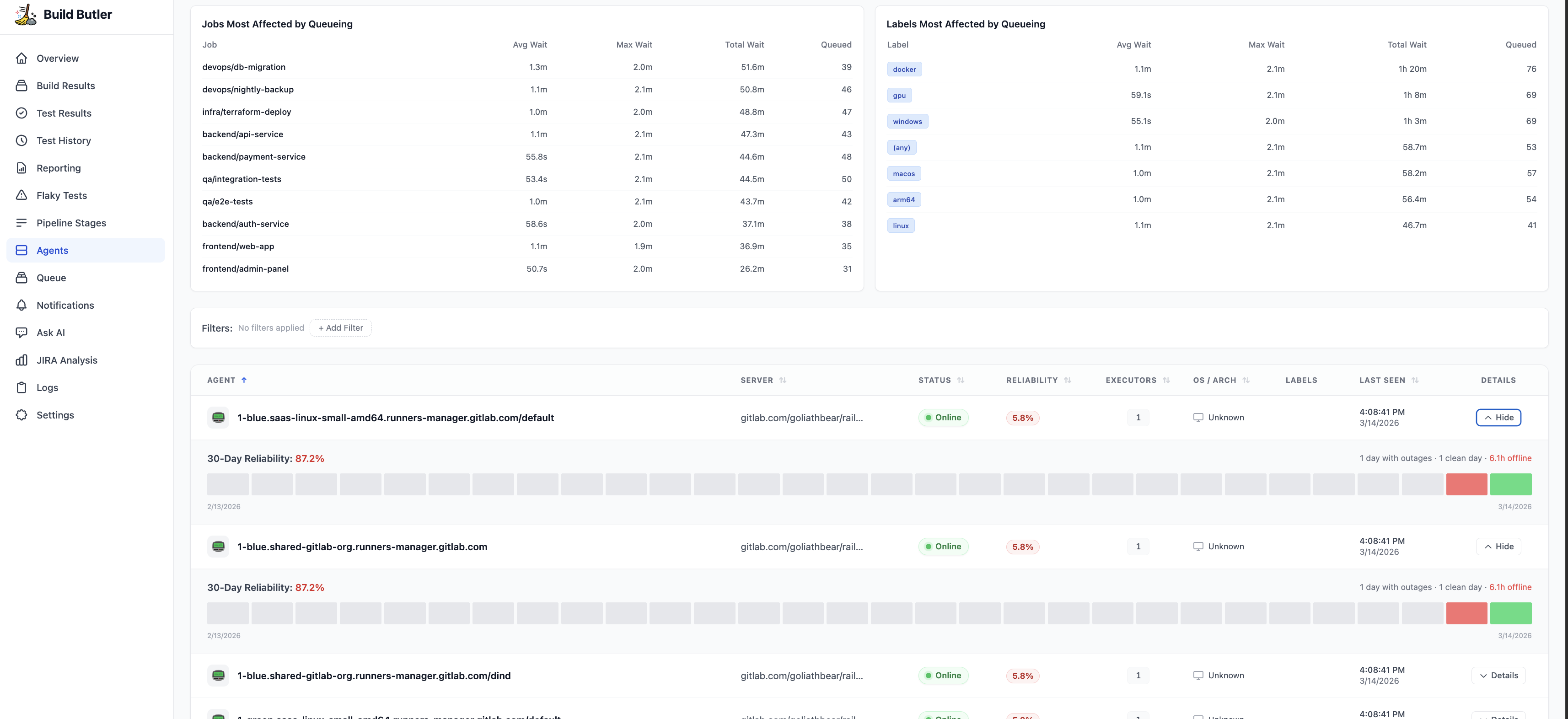 Monitor build agent status, reliability, and availability across all connected CI servers.