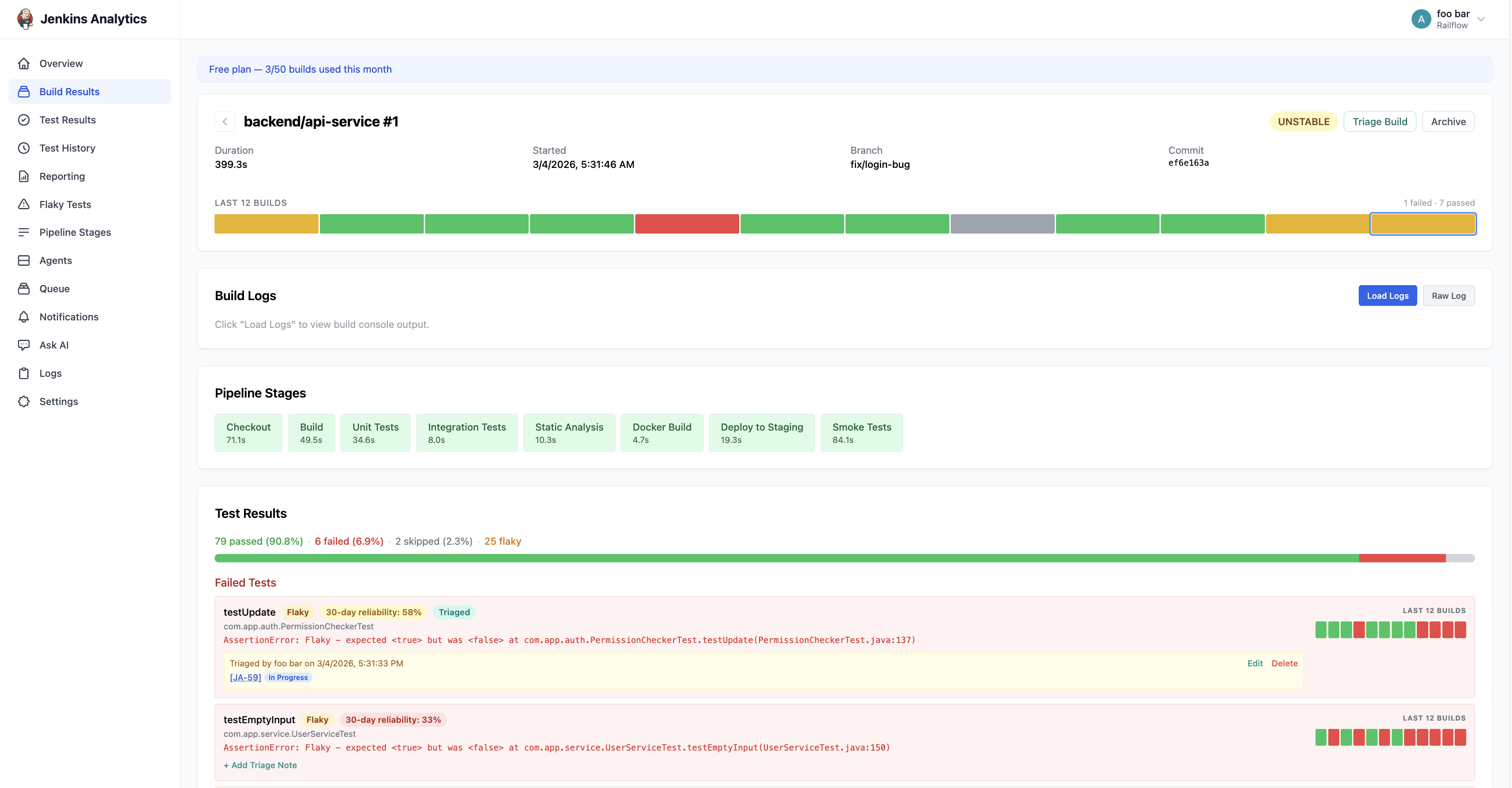 Drill into individual builds — pipeline stages, test results, build logs, build triage, test triage, and JIRA references.