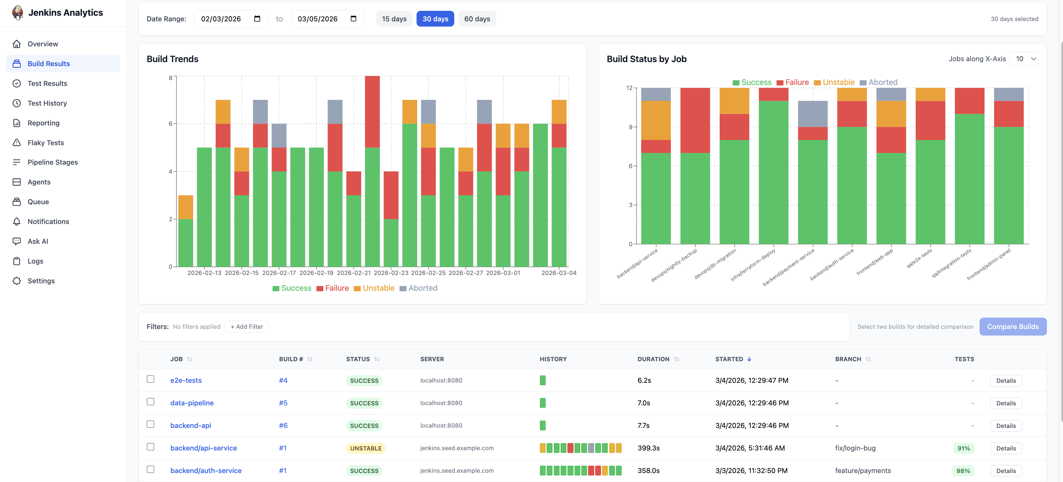 View build trends, status breakdowns, and a filterable table of every build across all your CI jobs.
