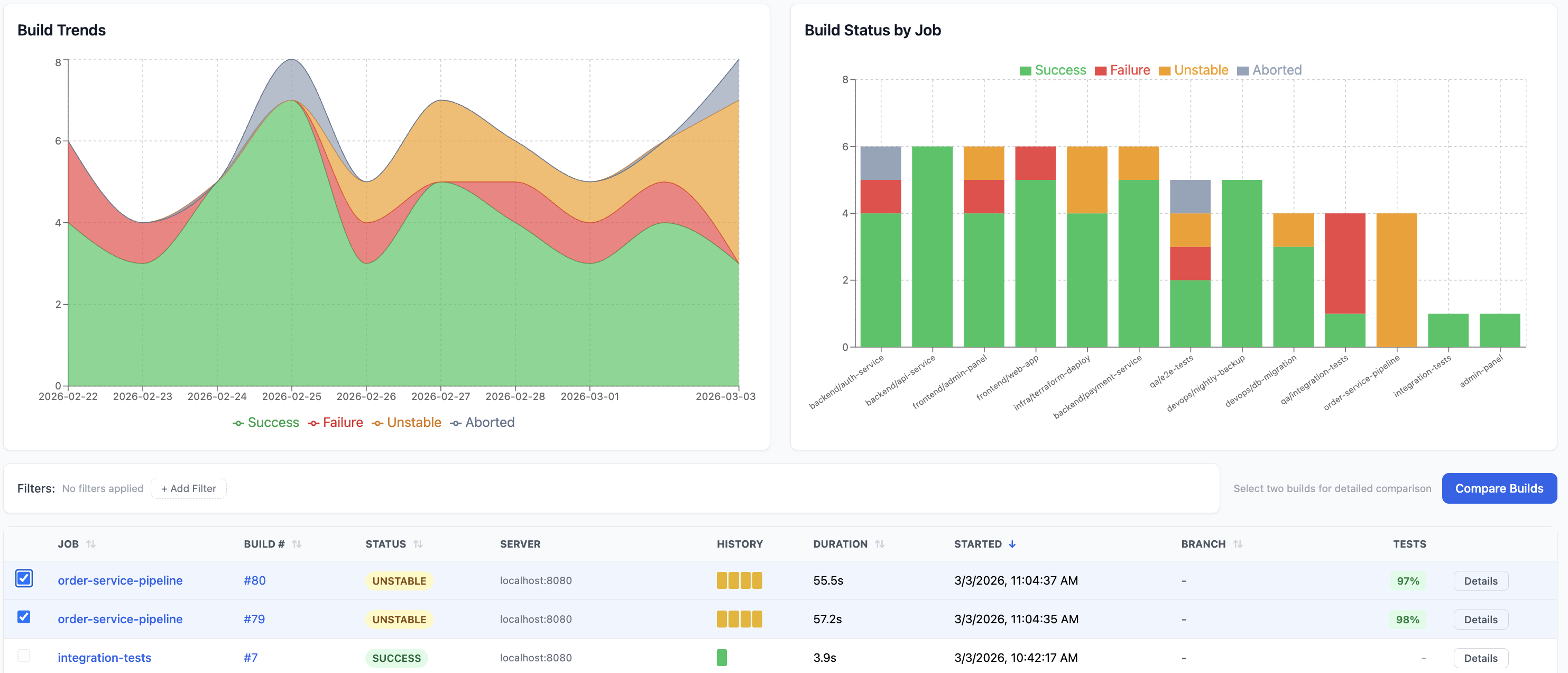 The Compare Builds feature lets you place any two builds side-by-side and see exactly what changed between them.