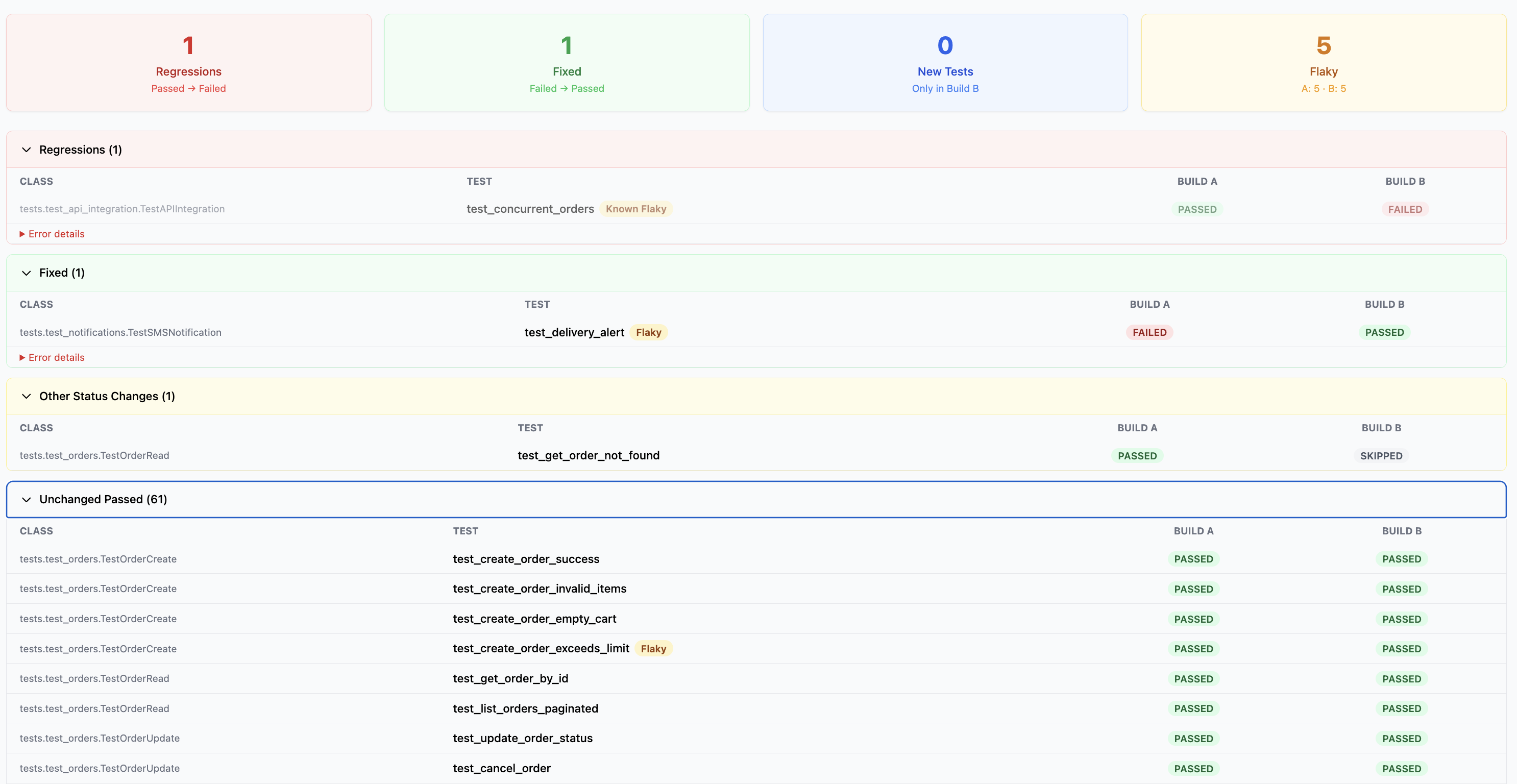 - Unchanged Passed — all tests that passed in both builds