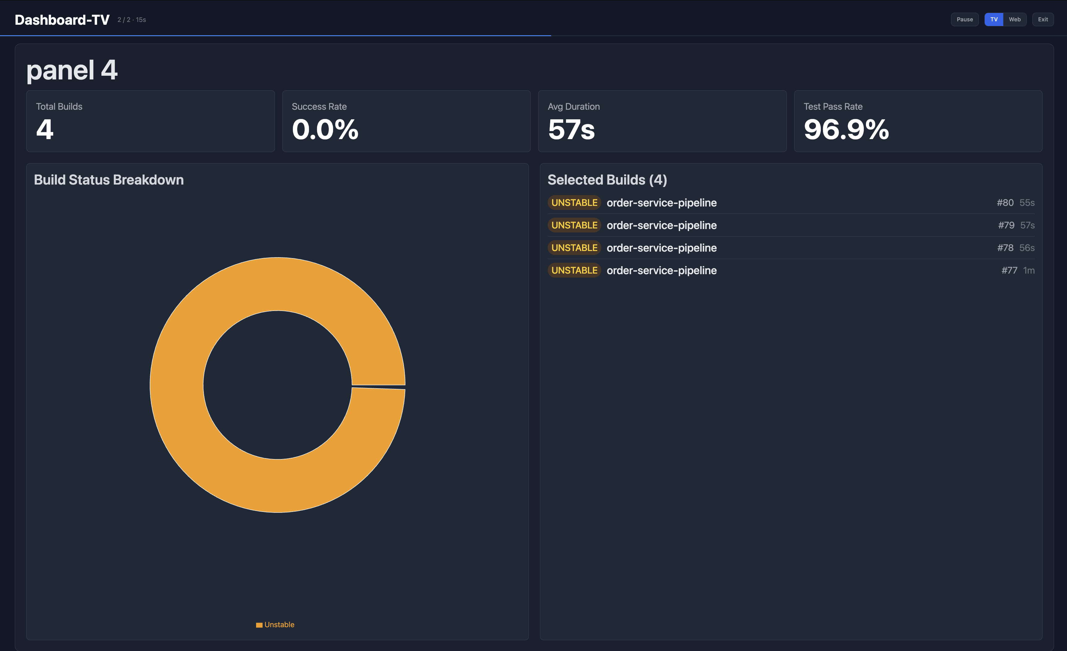 Create TV-ready dashboards with build trends, duration analytics, and customisable panels.