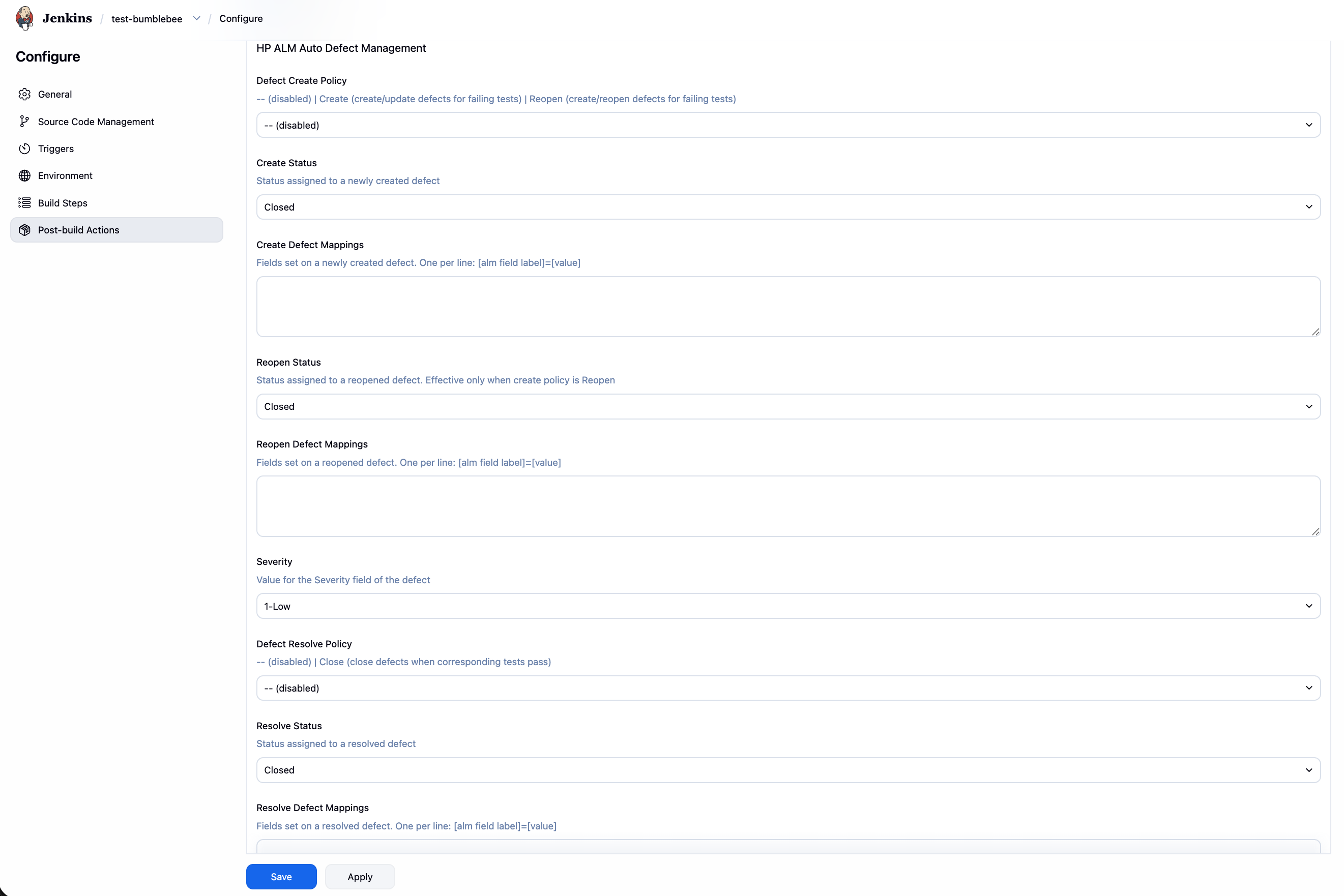 Defect management is configured as part of the HP ALM Uploader post-build step. Defects are created, reopened, or closed automatically based on test results.