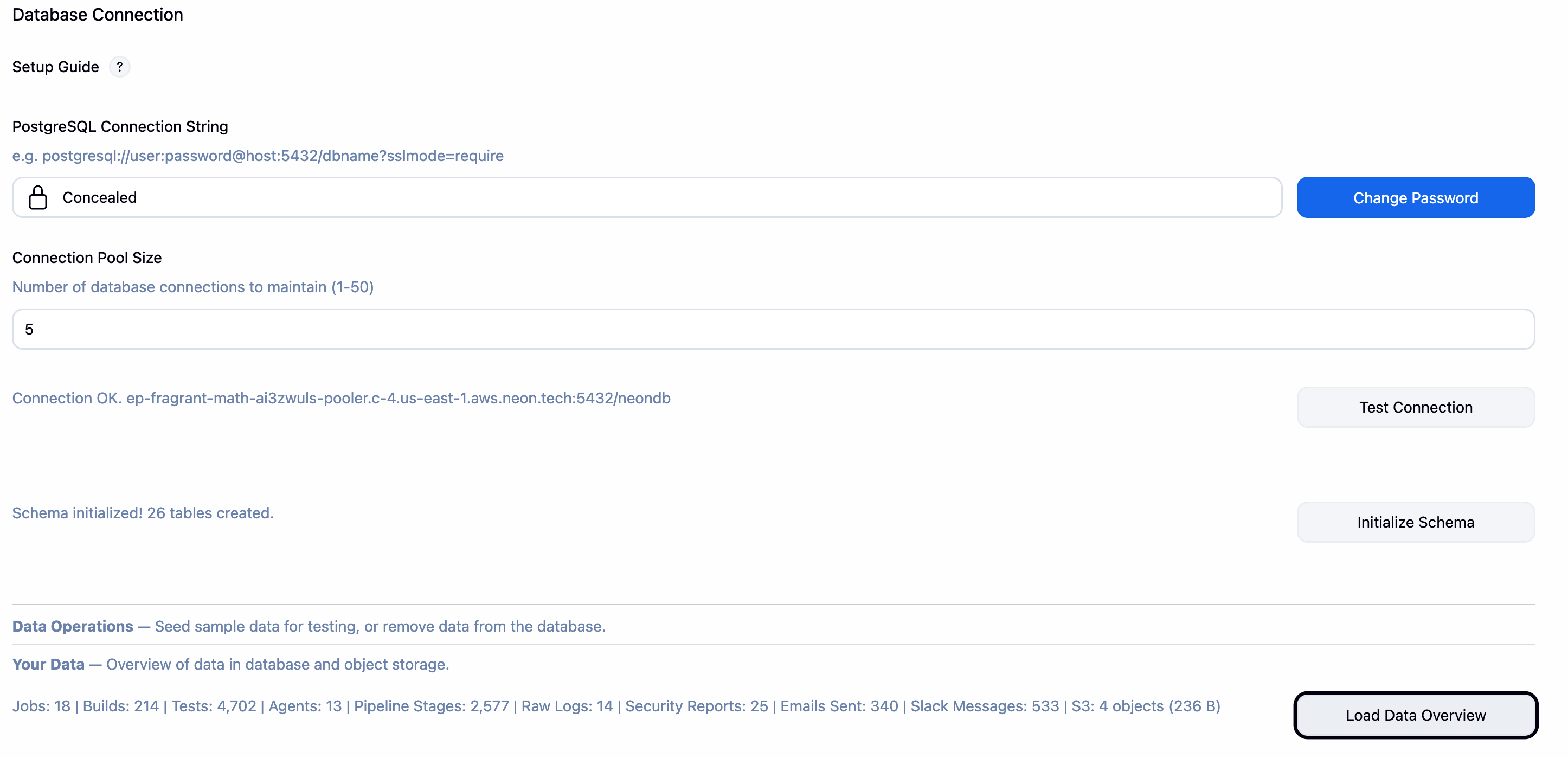 Enter your PostgreSQL connection details. Click Test Connection to verify, then Initialize Schema to create the required tables on first setup.