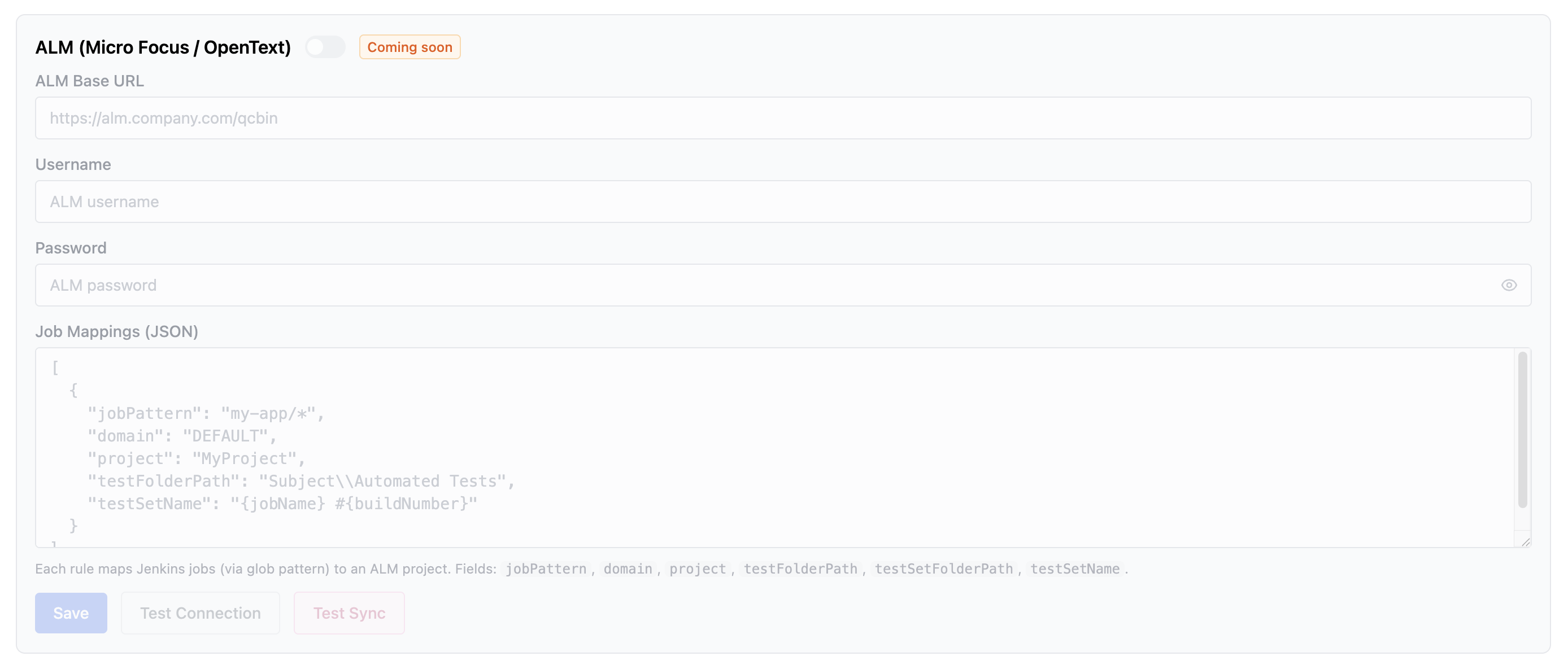 See Jenkins Local → ALM Integration → ALM Field Mappings XML for the full format reference and an example.