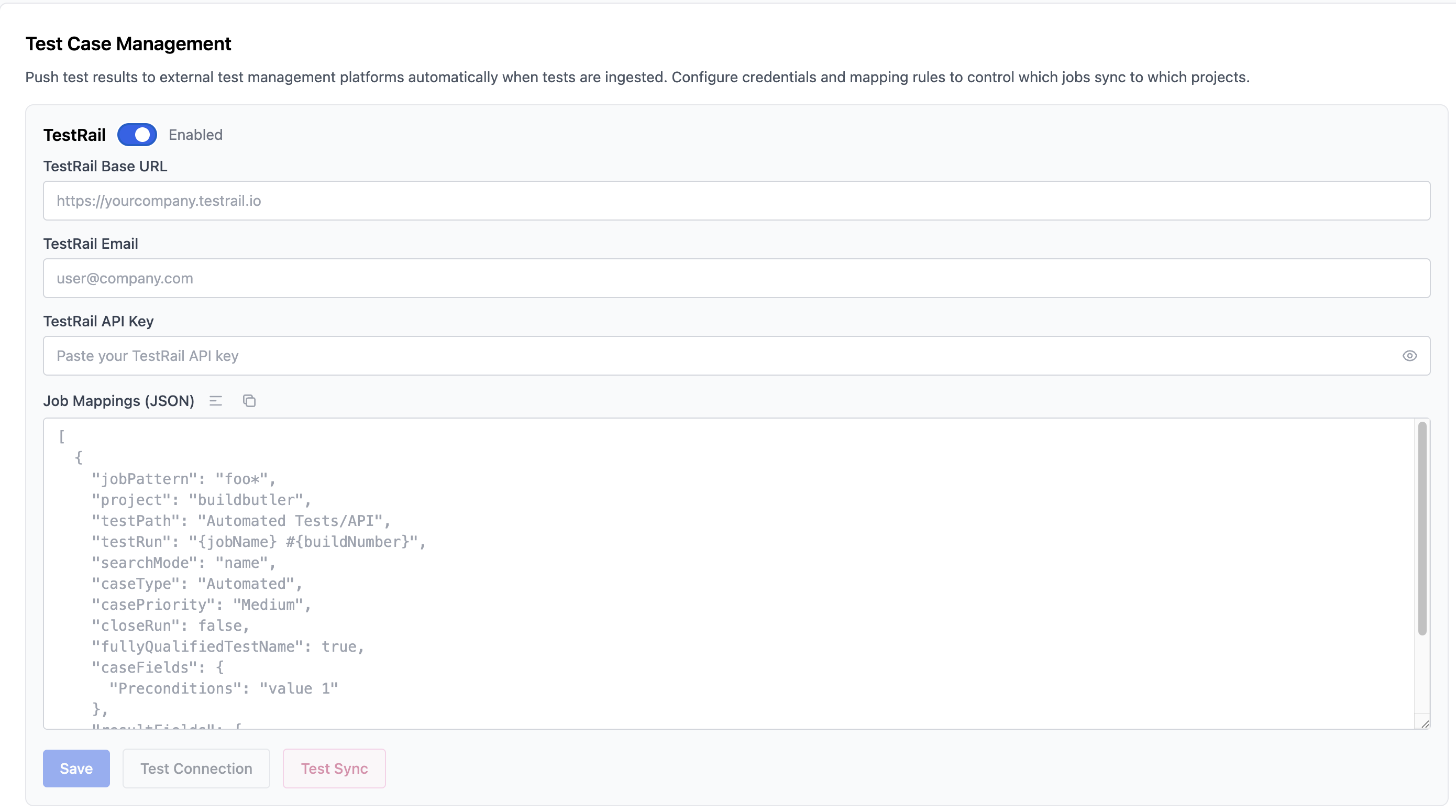 Push test results to external test management platforms automatically when tests are ingested. Configure credentials and mapping rules to control which jobs sync to which projects.